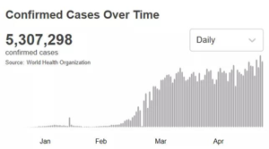 根據(jù)世衛(wèi)組織最新實時統(tǒng)計數(shù)據(jù),截至北京時間5月26日0時42分,全球累計新冠肺炎確診病例5307298例,死亡病例342070例。